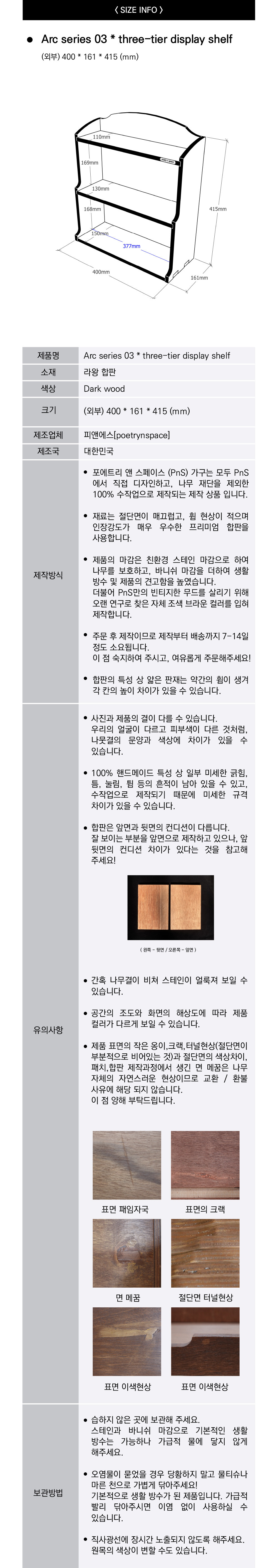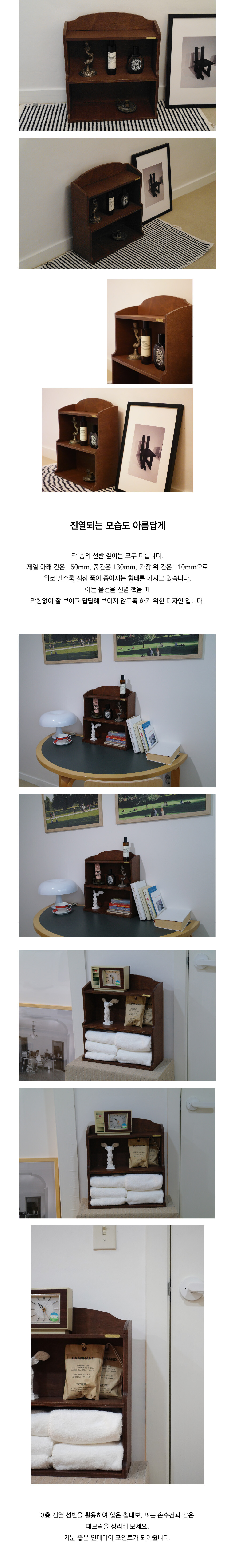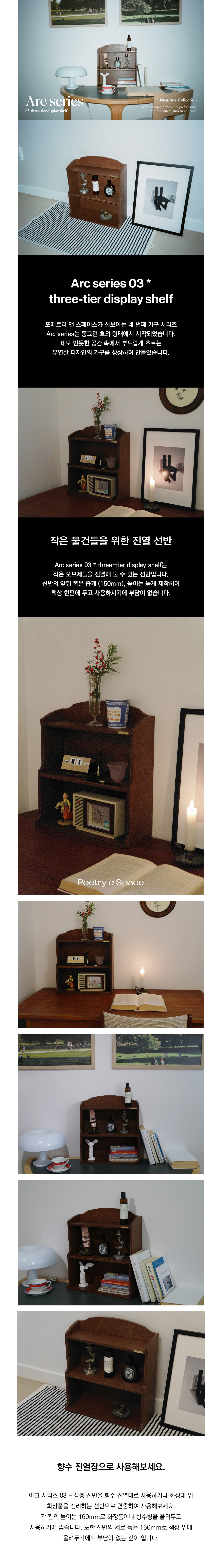 Arc series 03 * three-tier display shelf는 아끼는 물건이나 자주 손이 가는 물건들을 진열해 둘 수 있는 3층 진열선반 입니다. 선반의 앞뒤 폭은 좁게(150mm), 높이는 높게 제작하여 책상 한편에 두고 사용하시기에 부담이 없도록 디자인한 제품입니다.