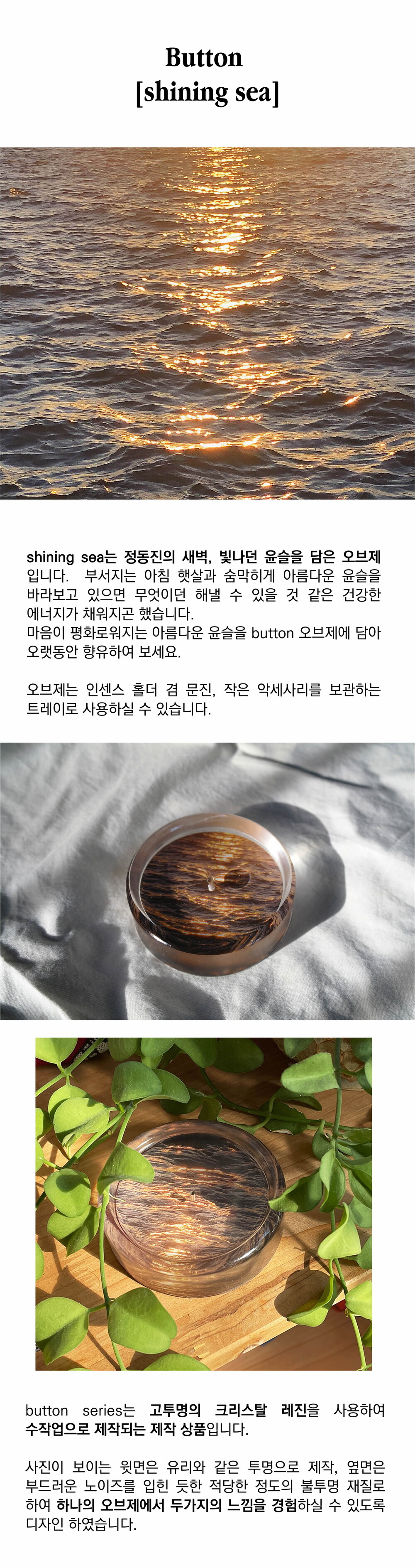 마음이 평화로워지는 아름다운 윤슬을 button 오브제에 담아 오랫동안 향유하여 보세요.