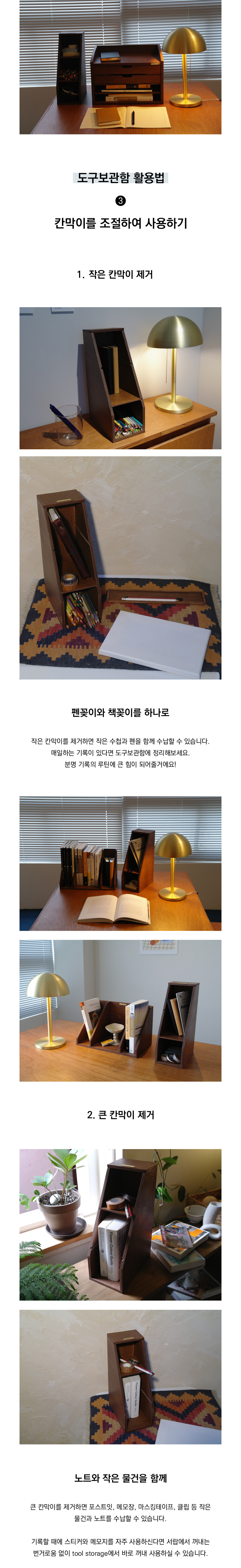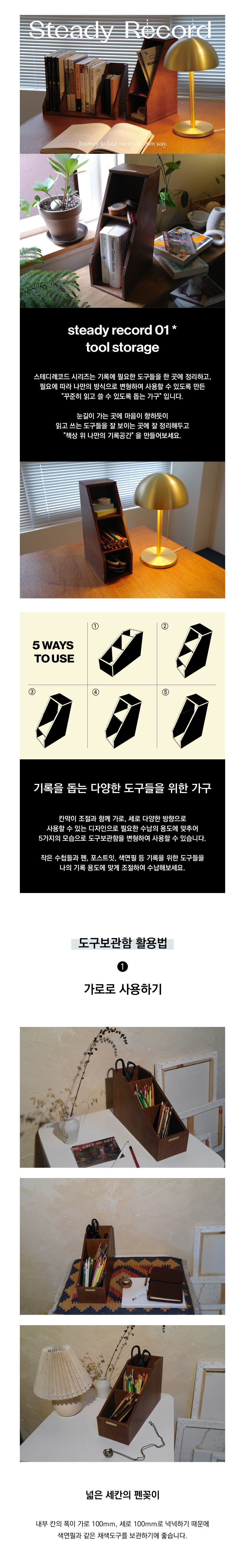 칸막이 조절과 가로/세로 다양한 방향으로 사용할 수 있는 디자인으로 나만의 기록 습관과 필요한 수납의 용도에 맞추어 tool storage를 변형하여 사용할 수 있습니다.